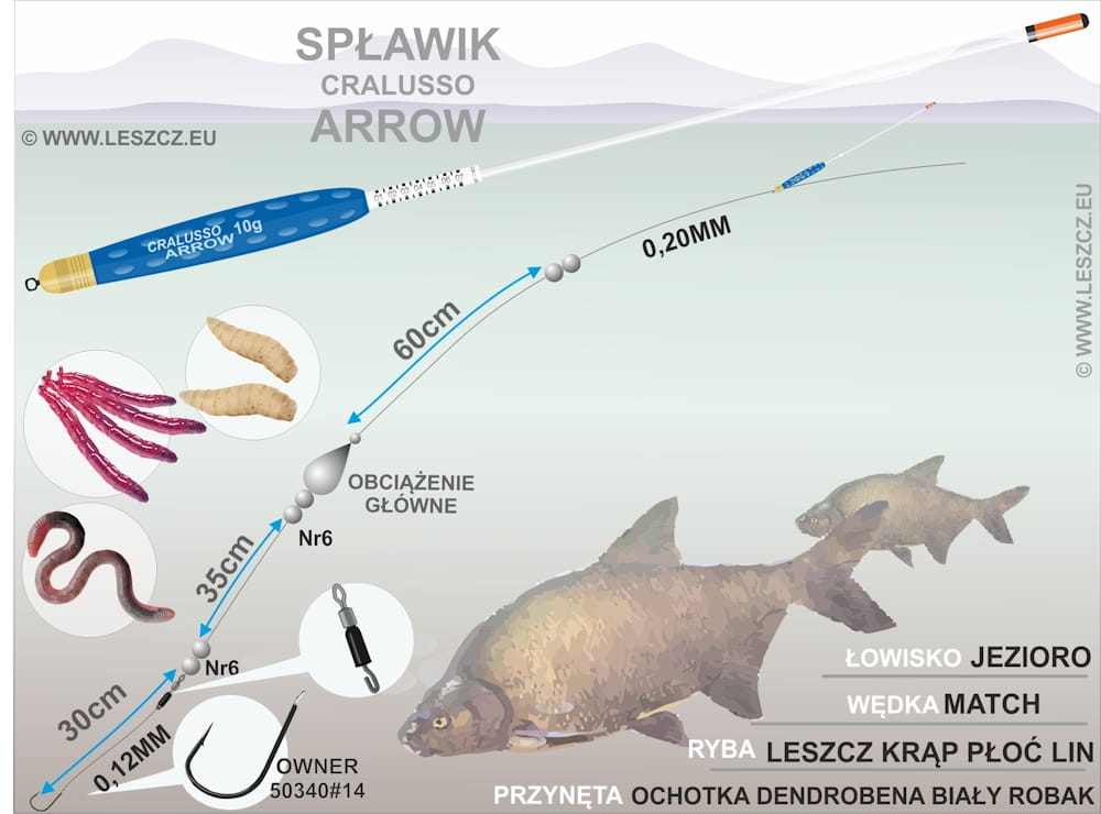 Zestaw do łowienia odległościówką ze spławikiem Cralusso Arrow mocowanym przelotowo na żyłce. Na żyłce znajduje się 25–30% obciążenia, a reszta wbudowana jest w spławik (tzw. zestaw czeski). Zestawem tym można łowić na jeziorach, kanałach i wolno płynących rzekach o głębokości od 1,5 do 10 m. Większymi gramaturami można schodzić jeszcze głębiej. Zestaw stosunkowo szybko opada, dlatego świetnie sprawdza się przy łowieniu leszczy, linów, karasi, a także płoci i krąpi.