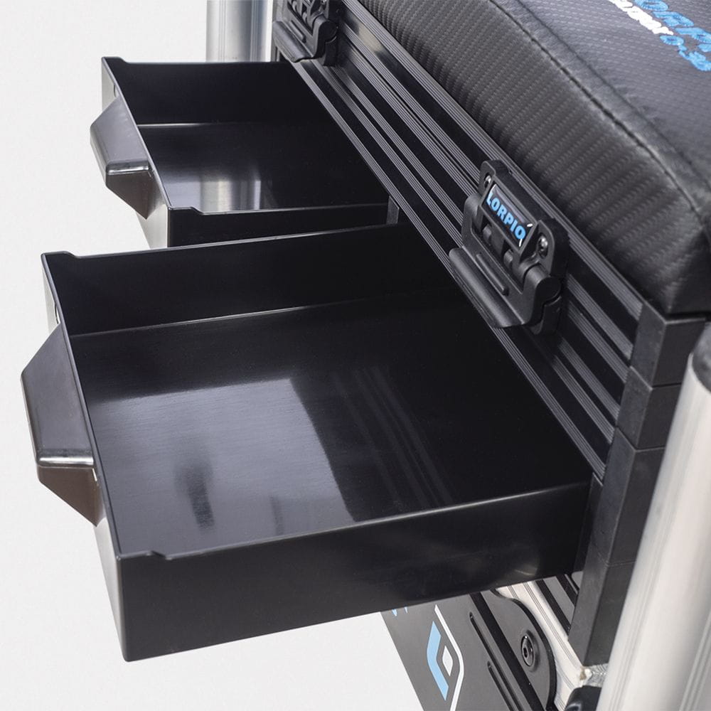 Siedzisko o wymiarach 41×29 cm jest wygodne, a pojemne kasety oraz dwie przednie szuflady zapewniają miejsce na niezbędne akcesoria. Pod siedziskiem znajduje się płytka kaseta (4 cm), a głębsza (10 cm) służy do przechowywania większych elementów. Wbudowana poziomica ułatwia prawidłowe wypoziomowanie kosza na stanowisku. Dzięki niskiej wadze 7,5 kg oraz szerokiemu, regulowanemu paskowi naramiennemu transport kosza jest wyjątkowo łatwy i wygodny.