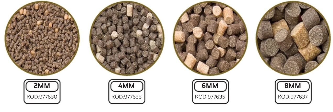 Granulacja 6MM - Świetnie sprawdza się do strzelania przy użyciu procy na dystans do 25m, dzięki czemu pellet o takim rozmiarze znajdzie swoje zastosowanie podczas łowienia na pellet waggler, sinking bomb oraz feeder bomb. Poza tym granulacja ta może zostać wykorzystana do wzbogacenia mieszanki zanętowej o grubszą frakcję co znacznie przyczyni się do większej selekcji rozmiarowej ryb żerujących w naszym łowisku.