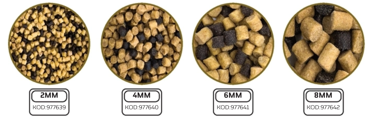 Granulacja 8MM - Dobrze sprawdza się do strzelania przy użyciu procy na dystans do 40M, dzięki czemu pellet o takim rozmiarze podobnie jak ten w rozmiarze 6MM znajdzie swoje zastosowanie podczas łowienia na takie metody jak pellet waggler, sinking bomb oraz feeder bomb. Poza tym wzbogacenie mieszanki zanętowej o pellet w tej granulacji znacząco przyczyni się do pozbycia się mniejszych ryb z naszego łowiska.